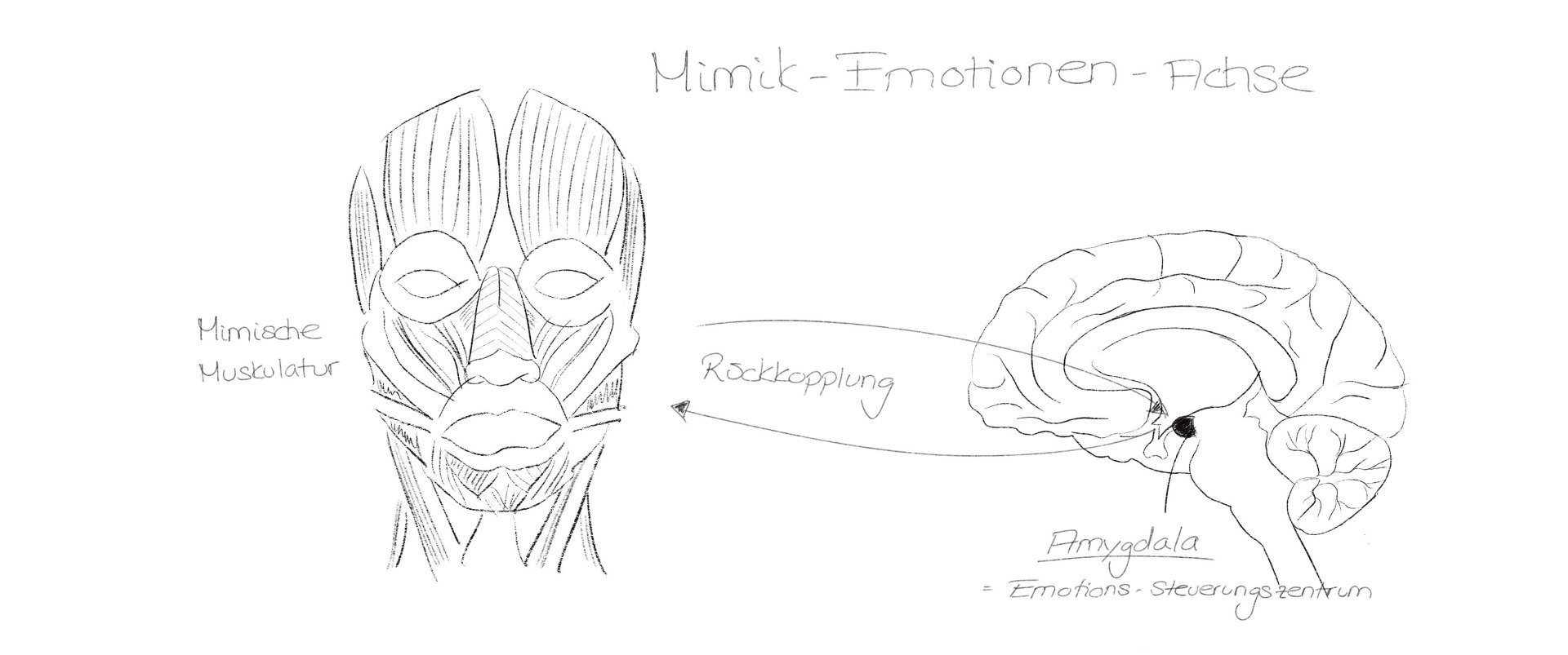 Mimik und Emotionen wirken in beide Richtungen. Es besteht eine sog. Rückkopplung. So können sowohl Emotionen zu einer bestimmten Mimik führen, als auch mimische Ausdrücke Emotionen induzieren (bzw. bestärken). Verantwortlich für die emotionale Verarbeitung unseres Gehirns ist die Amygdala (lat. Mandel), die eine direkte Verbindung zum Hippocampus (Lerngedächtnis) und dem motorischen System (v.a. Mimik) besitzt.